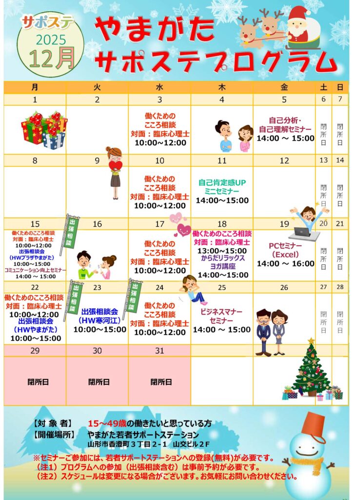 講座スケジュール 12月のイベントスケジュール 2025.12.01 2025.12.12 講座スケジュール やまがた若者サポートステーションの12月のサポートプログラムをご紹介いたします。 どなたでも参加できますので、お気軽にお申込みください。 イベント情報をみる Post Share Hatena Pocket RSS feedly Pin it 記事のタイトルとURLをコピーする 11月のイベントスケジュール 前の記事 令和8年1月のイベントスケジュール 次の記事 関連記事 6月のイベントスケジュール 2025.05.15 5月のイベントスケジュール 2025.04.18 10月のイベントスケジュール 2025.09.24 4月のイベントスケジュール 2025.04.18 11月のイベントスケジュール 2025.10.27 9月のイベントスケジュール 2025.08.27 7月のイベントスケジュール 2025.06.20 8月のイベントスケジュール 2025.07.23